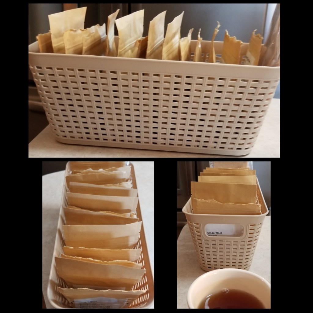 Since I just ordered 8 new packs of tea, I needed a bigger container to store them in. I popped over to Dollar Tree and picked up this little basket which fit perfectly in the corner of the pantry. The tea bags themselves were a little big because the basket narrows at the bottom, but I just folded the sides of the bags and they were able to fit nicely.