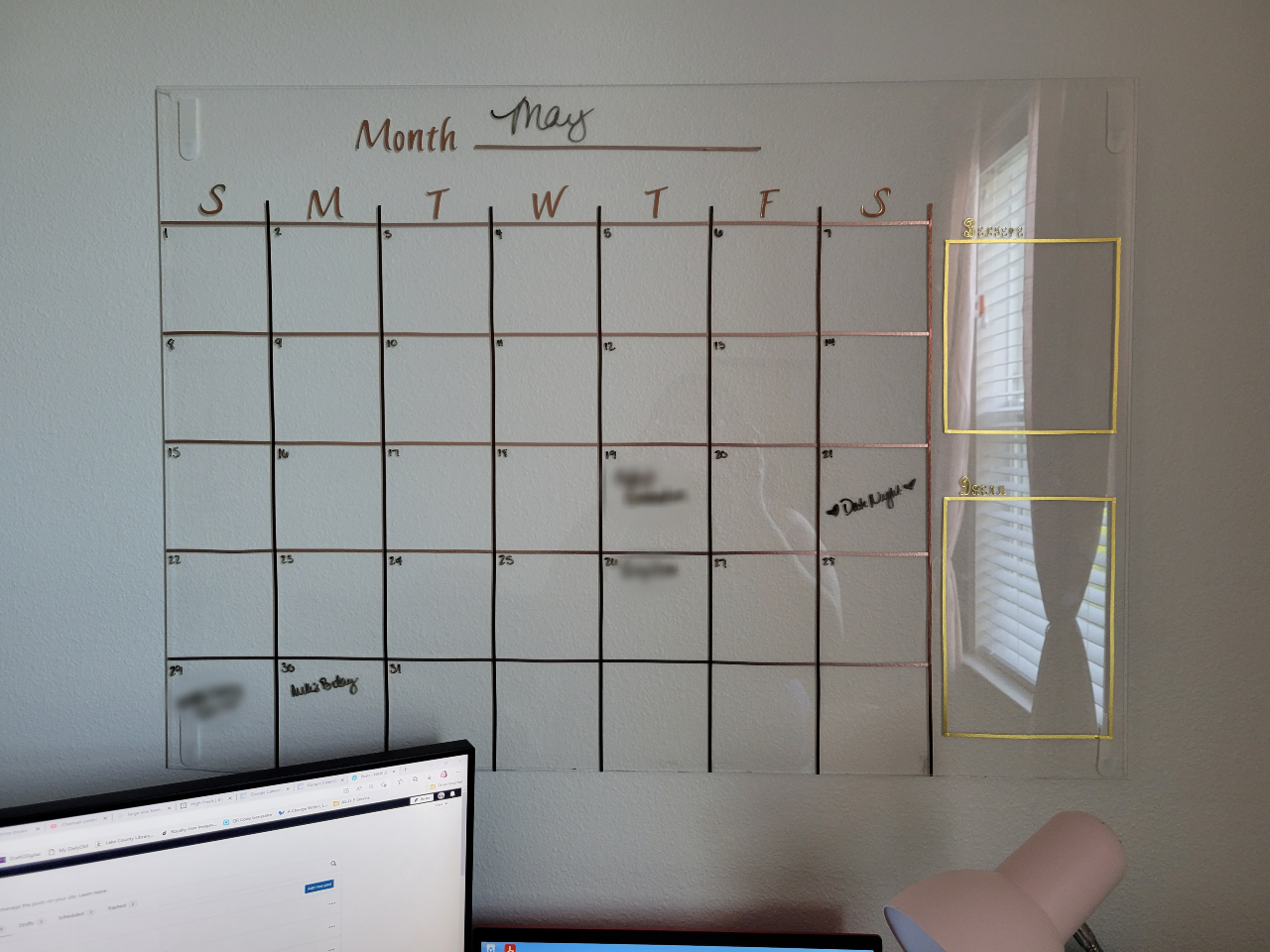 Bright idea #2 came later as I was searching for other things to do with clear acrylic. I’ve always hated paper desk calendars because they require me to move my keyboard and all the other aforementioned items that litter my desk in order to use them. When I stumbled upon acrylic wall calendars, though, the sky opened up and angels came down to rest on my phone screen.