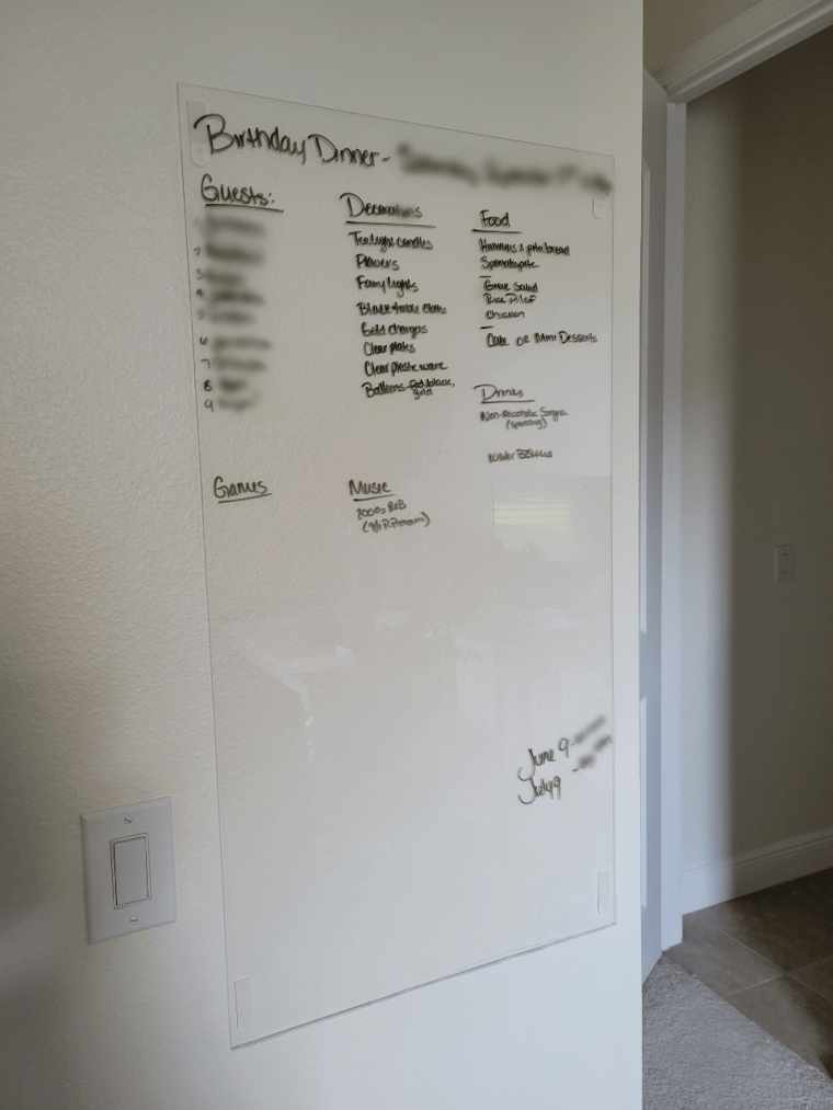 Enter bright idea #1 – a clear dry erase board for the wall. I’ll be honest and say this was not an original idea. I had a small one saved in my Etsy favorites, but it was going to cost some change that I did not want to spend. I figured now that I had a couple sheets of clear acrylic with no purpose, I could just make my own.