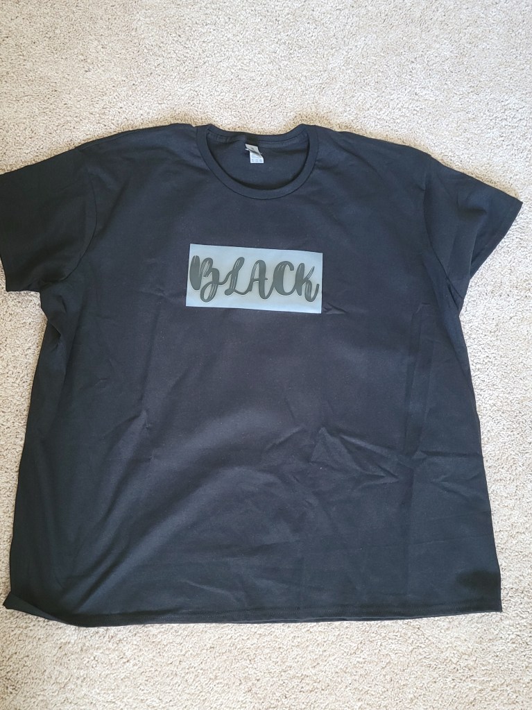 This one came out much better. The positioning was a little higher on the chest than I realized it would be, but it looks good and I’m excited to wear it this week. It is definitely screen printed on top of the fabric rather than into the fabric like I would’ve preferred, and the way the light reflects off of it makes it look gray in the picture, but that’s what this testing period is about. I’m just trying to find the best version of the products I want.